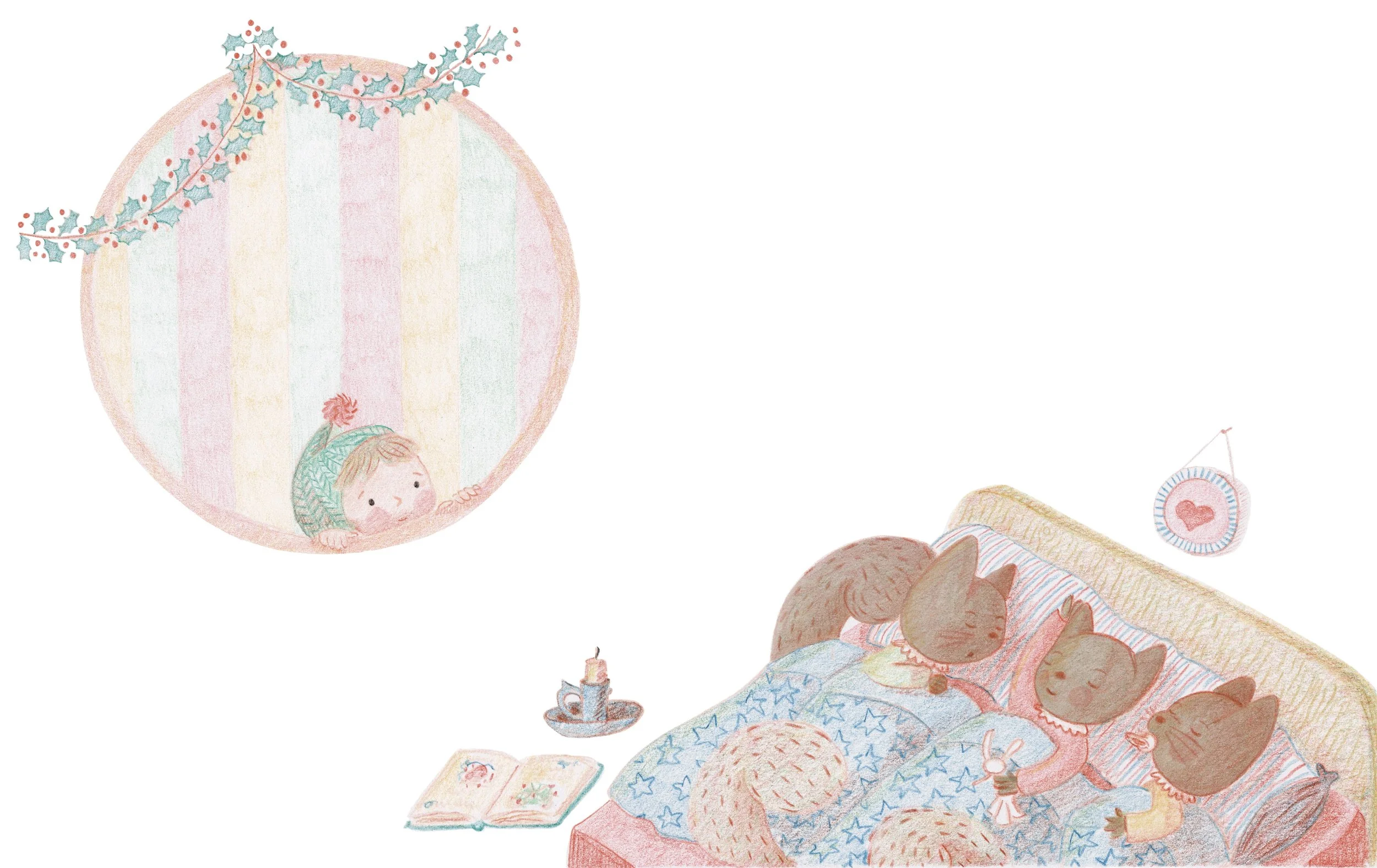 … three little squirrels tucked under a cosy quilt, their furry tails peeking out like fluffy ribbons.